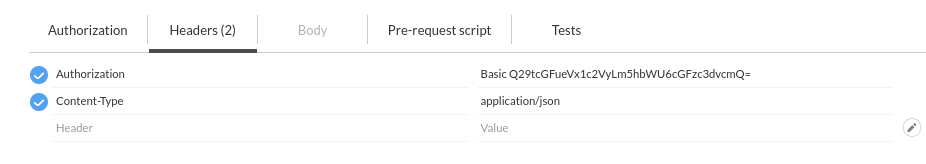 For HTTP basic authentication, each request must include an Authentication header with a Base64 encoded value. After clicking the second tab ‘Headers’, two input fields appear, in the first we choose the type of Header, which is ‘Authorization’. In the second input field, we have to enter “Basic” and a Base64 encoded String which has the following format: