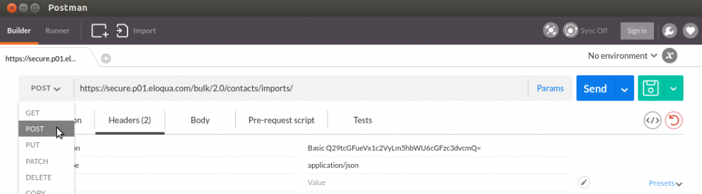 Step two is to enter the Request URL which is a combination of the BaseURL “https://secure.p01.eloqua.com/BULK/2.0/” and the endpoint “contacts/imports/”.