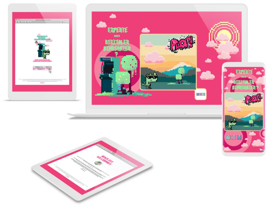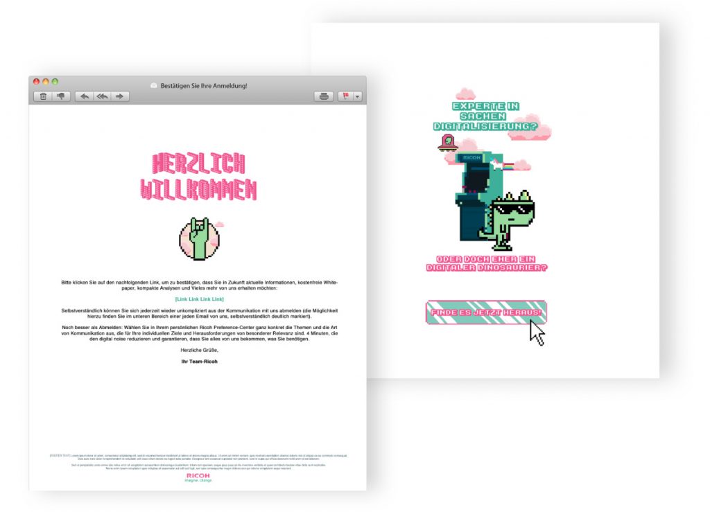 So entstand ein auf das zentrale Thema des Unternehmens abgestimmtes Browser-Game, welches die Kontakte dazu nutzen konnten, um ihr Wissen im Bereich Digitalisierung zu testen und so gemeinsam mit dem Helden des Games, dem digitalen Dinosaurier, die Welt zu retten. Die letzte Station des Spiels war es, die Kontakte zu einer dedizierten Landing Page zu leiten, auf der sie ihr Double Opt-In geben konnten, um in Zukunft weitere Kommunikation von Ricoh zu erhalten. Der ansprechende und experimentelle Charakter des Spiels konnte einen großen Teil der Kontakte dazu animieren, dank ihres Double Opt-Ins weiterhin in Kontakt mit dem Ricoh Marketing zu bleiben.